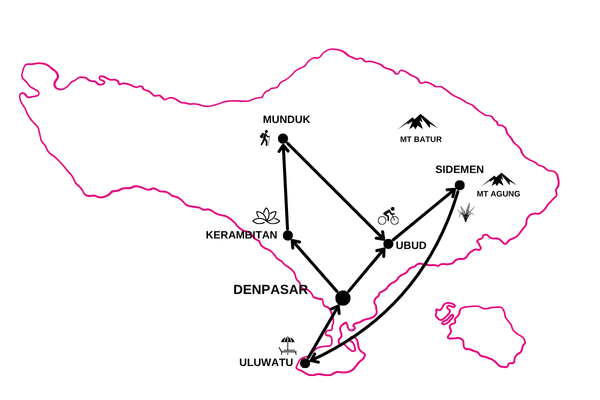Un circuit complet à la découverte de Bali : ses temples, sa culture, ses marchés, son artisanat, sa végétation luxuriante et ses majestueuses rizières. Profitez d'activités intimistes et romantiques pour un voyage à deux unique : massages et soins en duos, dîner romantique, cours de cuisine, etc. et découvrez la campagne balinaise à bord d'une jeep décapotable lors d'une journée inoubliable !